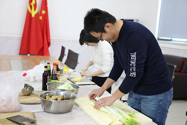 冬至宴熱鬧有序的進行著,大家分工明確,以飽滿的熱情投入這場活動中,先開始行動的就是我們的采買小隊,精心挑選食材,交于我們的帥哥-調(diào)餡擔當。