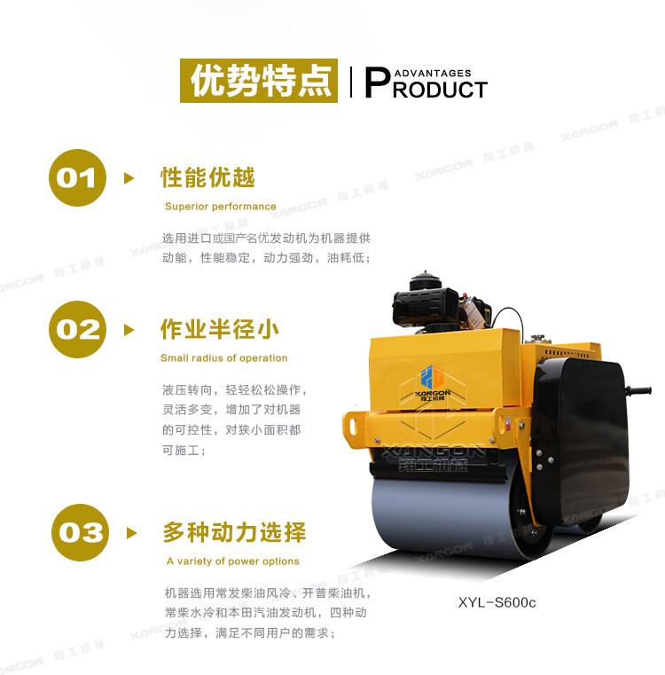 ·柴油動力采用電啟動,輕便靈活換向機構(gòu);雙驅(qū)雙振,保證了整體的壓實和爬坡能力;