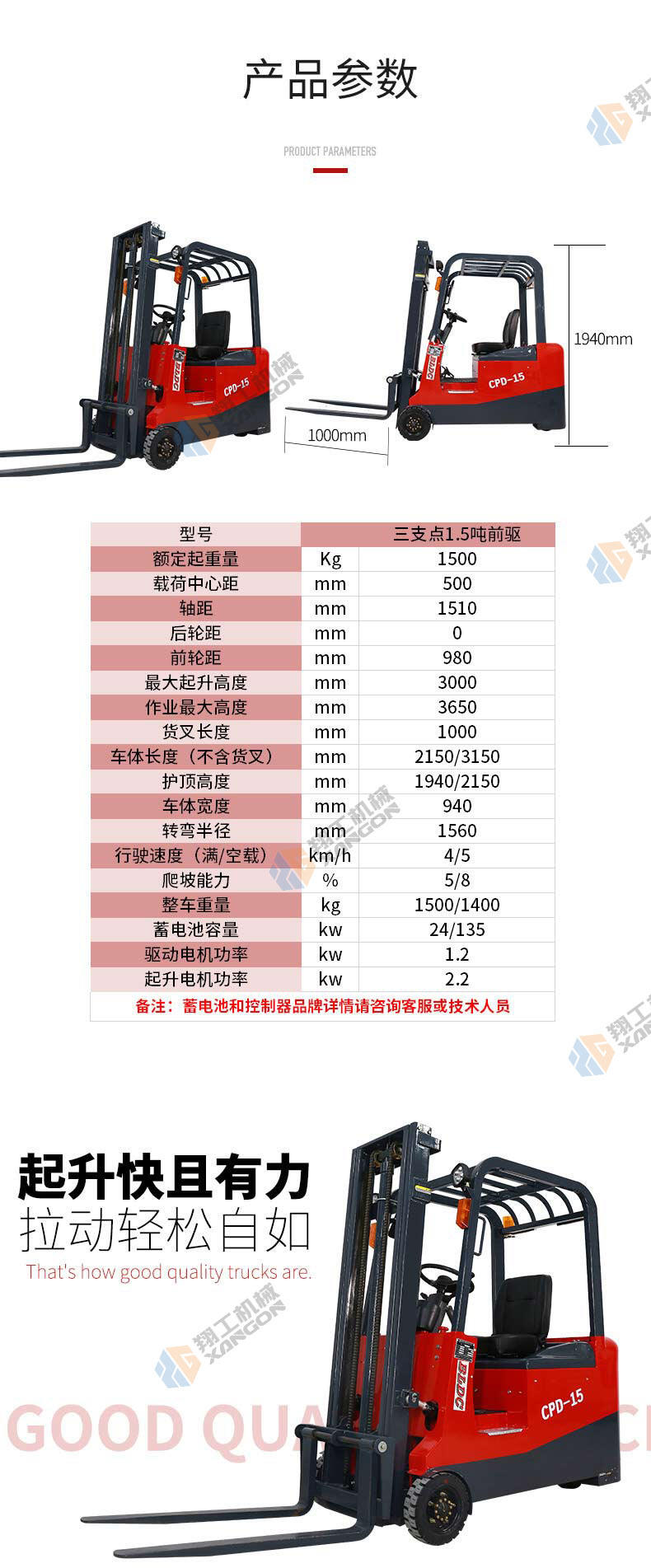 三支點(diǎn)CPD1.5噸前驅(qū)電動(dòng)升降液壓電動(dòng)叉車