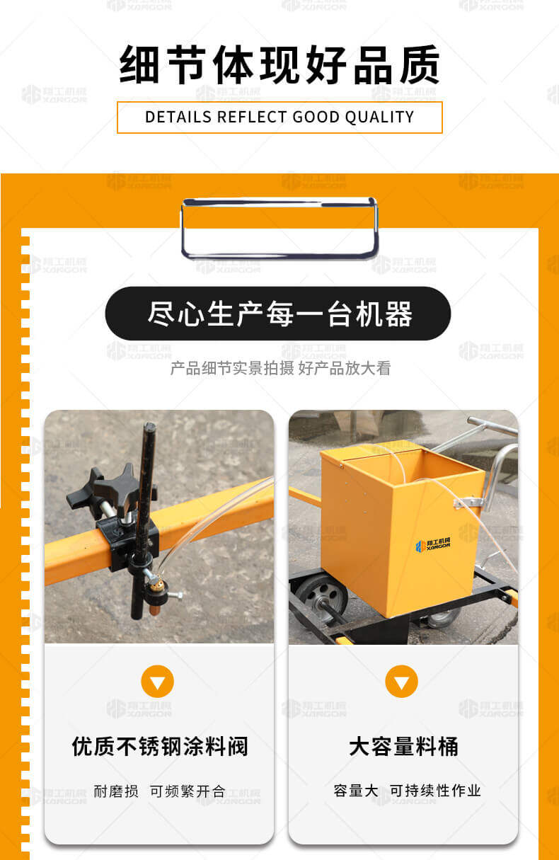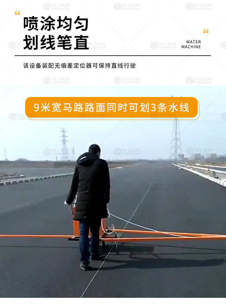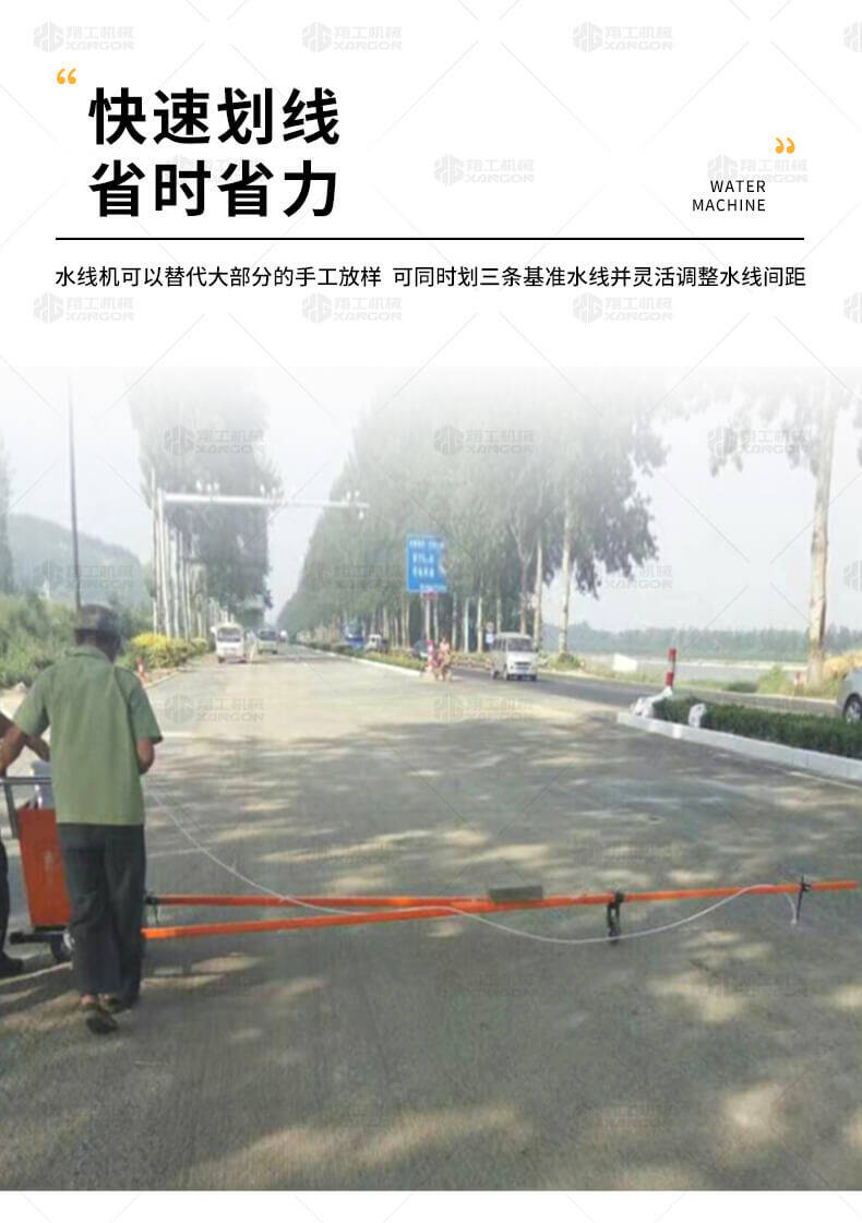 水線車是標線施工前序工作中施劃水線放樣的專用設備。 水線是標線施工前必不可少的工序,水線機可以替代大部分的手工放樣,降低勞動強度,提高工作效率,省時省力。 本產品可同時劃三條基準線(水線),可靈活調整水線間距;水線架和伸縮桿可折疊、拆卸,便宜運輸。 在施工前,在所要施劃標線的位置上需先涂劃水線,用以引導標線劃線機的施劃。