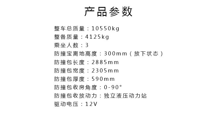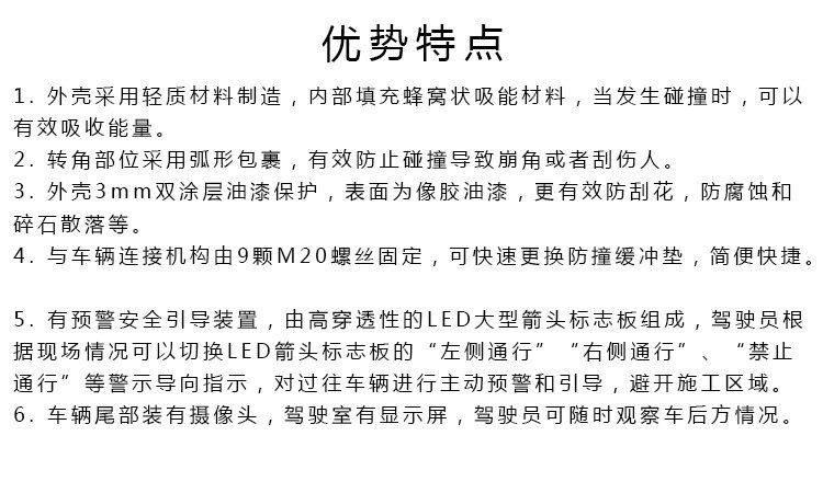 適用于高速公路、國省干線及市政道路的日常養(yǎng)護及應急搶險的安全防護。置于道路車輛、設備后方,在發(fā)生追尾事故中充當肇事車輛和施工作業(yè)人員或設備的緩沖區(qū)域,降低對人員的傷害。