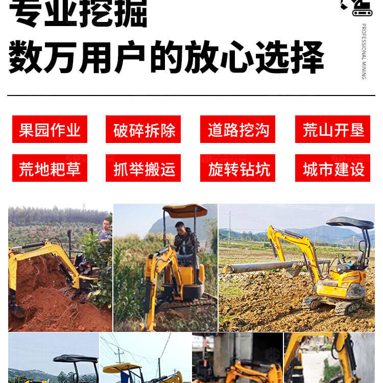 挖掘機廣泛應(yīng)用于果園苗圃、園林綠化、山地開荒、農(nóng)田改造、開挖自來水機電纜管道、室內(nèi)拆除、地面破碎、蔬菜大棚、養(yǎng)殖場、各種礦井及地道施工等。