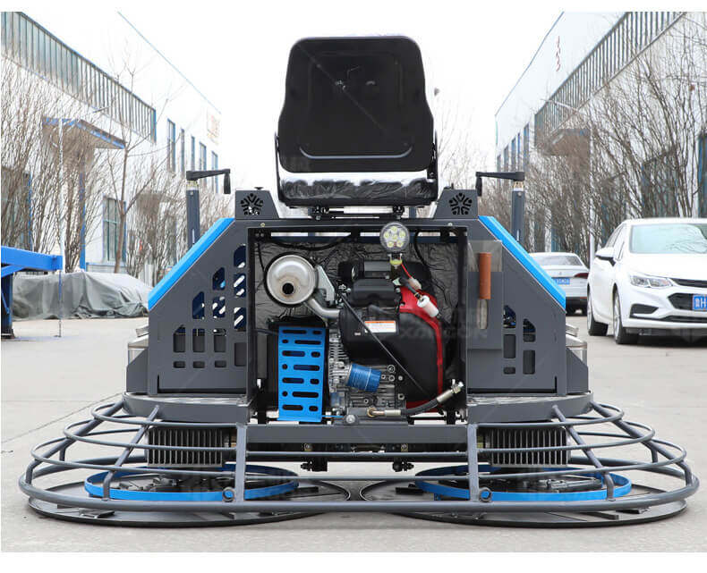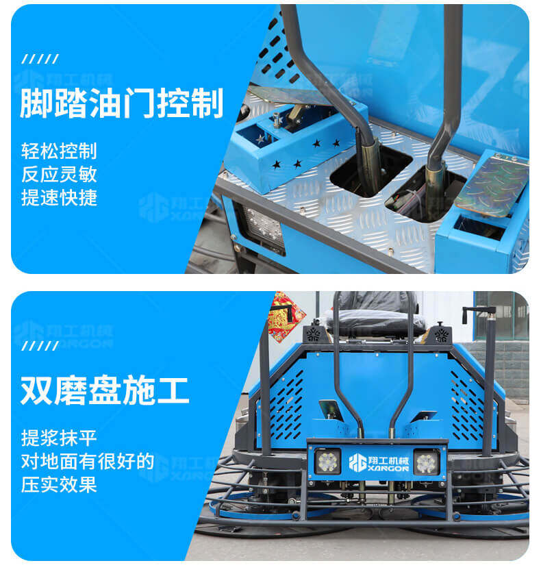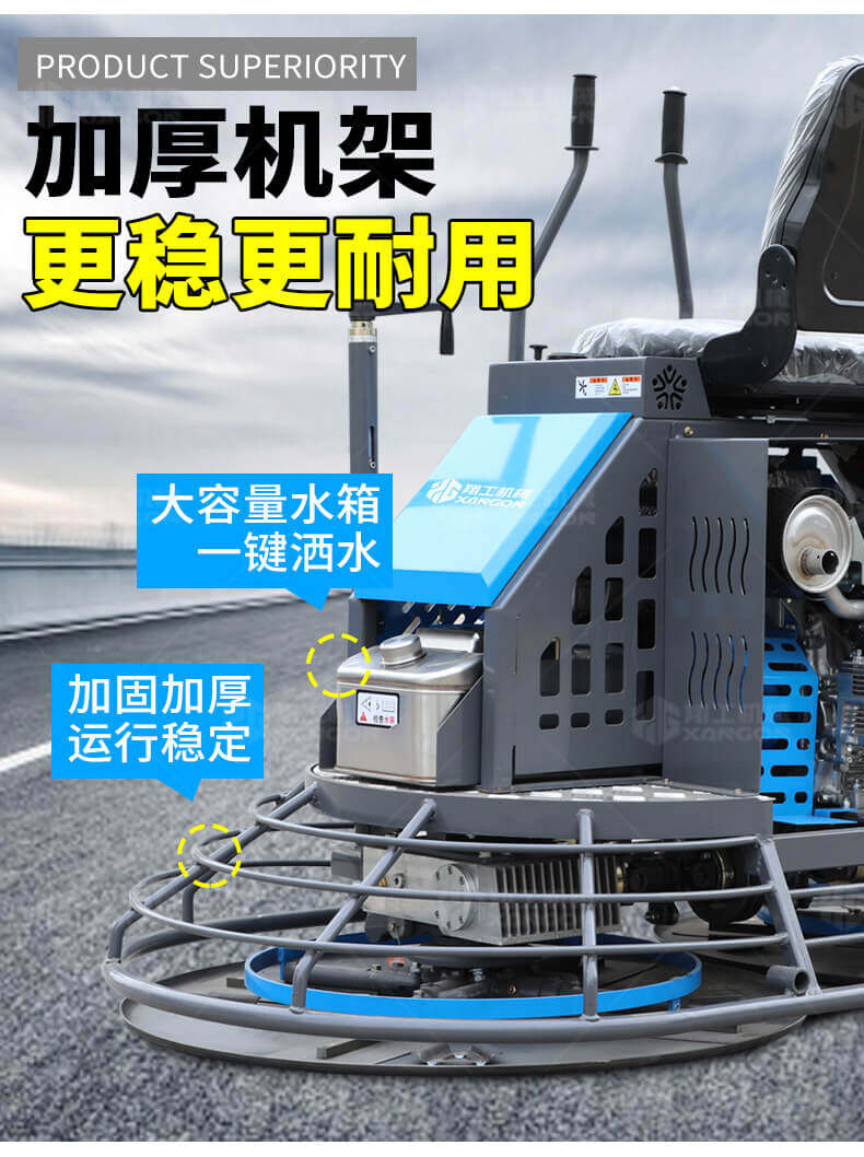 座駕式混凝土抹光機(jī)用于混凝土地面的提漿、壓實、抹平、抹光,相對于手扶式抹光機(jī),效率高。