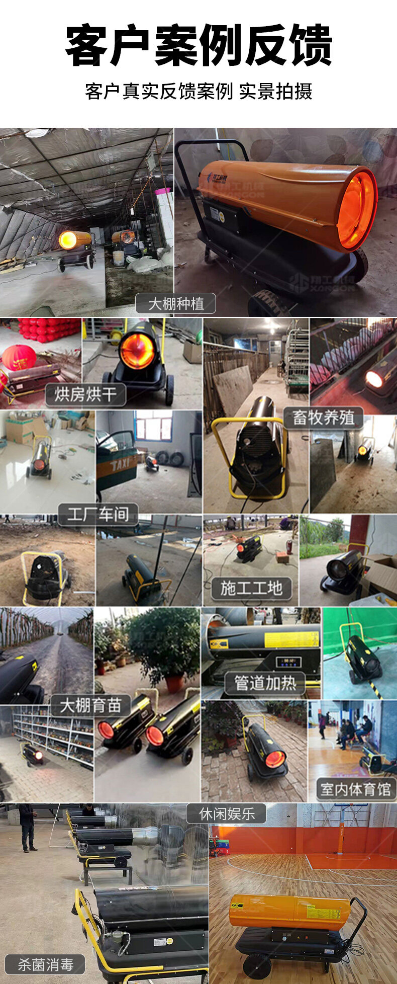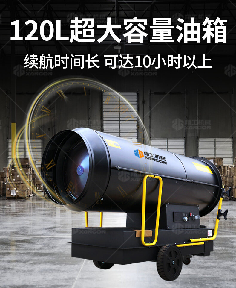燃油暖風(fēng)機(jī)可用于工廠倉(cāng)庫(kù),高大空間的供熱。 直燃熱風(fēng)機(jī),沒有煙囪; 燃料為柴油或者煤油; 氣體霧化燃燒器;