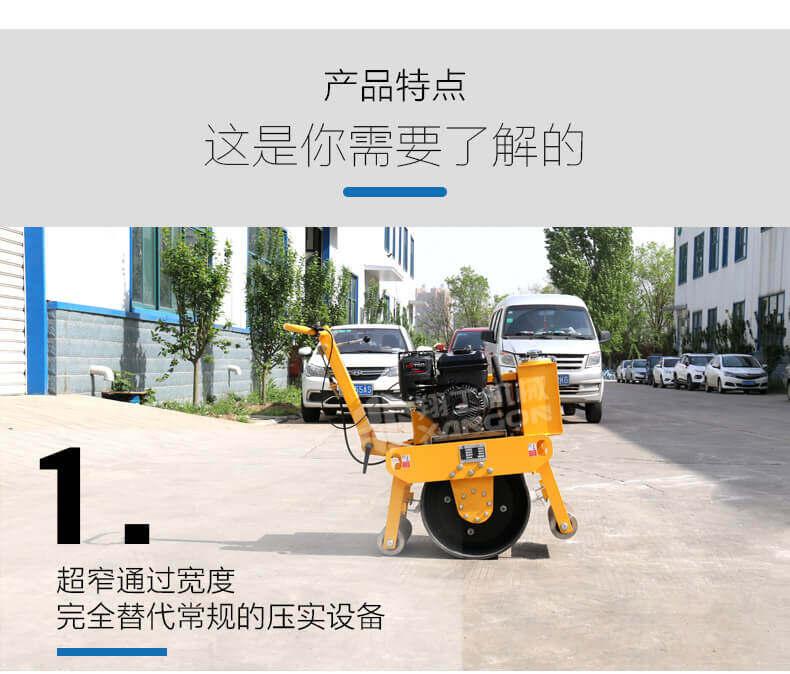 1. 超窄通過寬度,完全替代常規(guī)的壓實設備; 2. Honda 汽油機,品質保證, 性能優(yōu)越, 啟動容易; 3. 傳動機構采用名優(yōu)液壓傳動系統(tǒng), 換向方便, 實用壽命長; 4. 鋼輪分平輪和凸輪兩種, 更貼近工況。