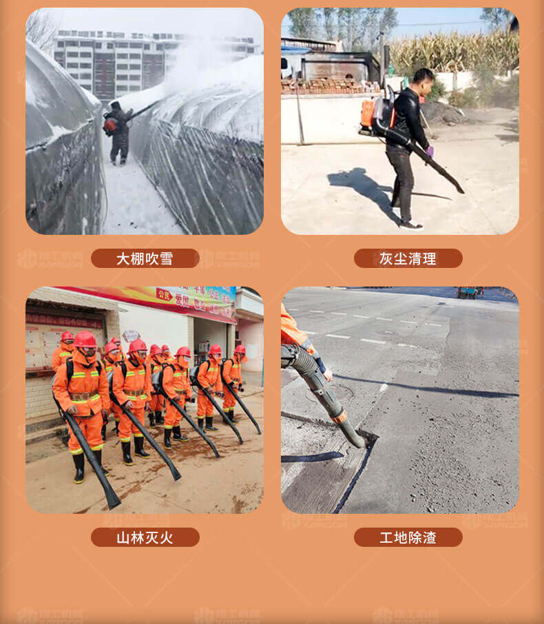 本機(jī)適用于修公路吹灰塵和吹雪,吹雪厚度達(dá)到15公分以上,鐵路上吹沙子,萊大柵溥膜上和露天的變壓器上吹雪(露天變壓器上吹雪時(shí),需再配2.8米的伸縮噴風(fēng)管)。公園內(nèi)吹落葉,院子內(nèi)吹雪及森林防火等.