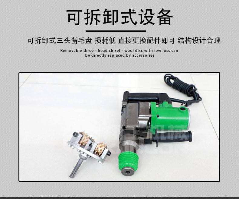 電動(dòng)手持式鑿毛機(jī) 金剛石三頭鑿毛設(shè)備 小型水泥路面拉毛機(jī)。該鑿毛機(jī)型主要應(yīng)用于高鐵、高速公路橋面、隧道、水利水電、核電、市政道橋、大型集裝箱場(chǎng)地、停車(chē)場(chǎng)、室內(nèi)外混凝土地面翻新除險(xiǎn)加固等混凝土面層鑿毛工程
