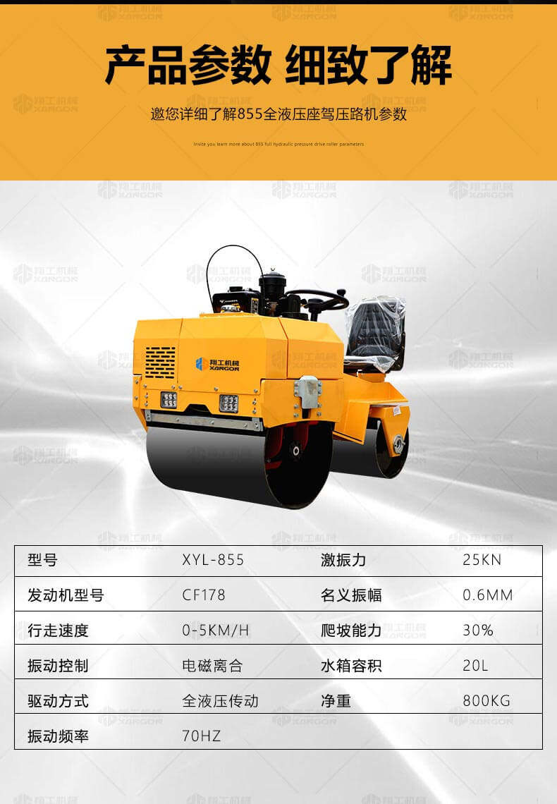 855座駕壓路機主要用于溝渠基礎,道路,體育場地的壓實整平,也可用于壓實瀝青表面的作業(yè)。