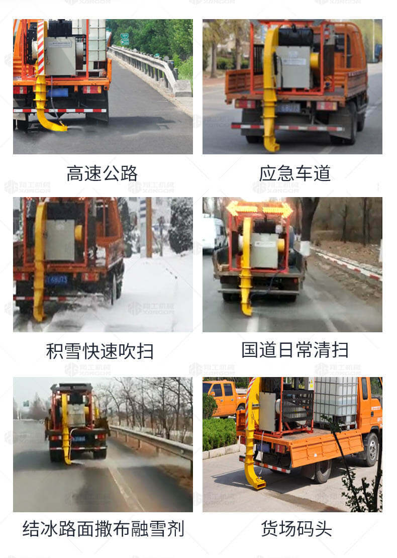 車載路面面吹風機主要適用于道路路面、貨場碼頭等場合的大面積清掃作業(yè)。主要由機架、動力、傳動、風機和控制等五個主要部分組成,并配有水霧降塵裝置。該機型采用車載作業(yè),整機尺寸小、重量不足700kg,一般的輕型卡車和微型卡車均可承載,使用4個地腳螺栓固定在承載車廂板上,短期使用亦可使用拉緊器固定。機架上方四個角部各有一個起吊環(huán),可使 用起重裝置方便地吊起。亦可使用叉車自底座底部叉起。