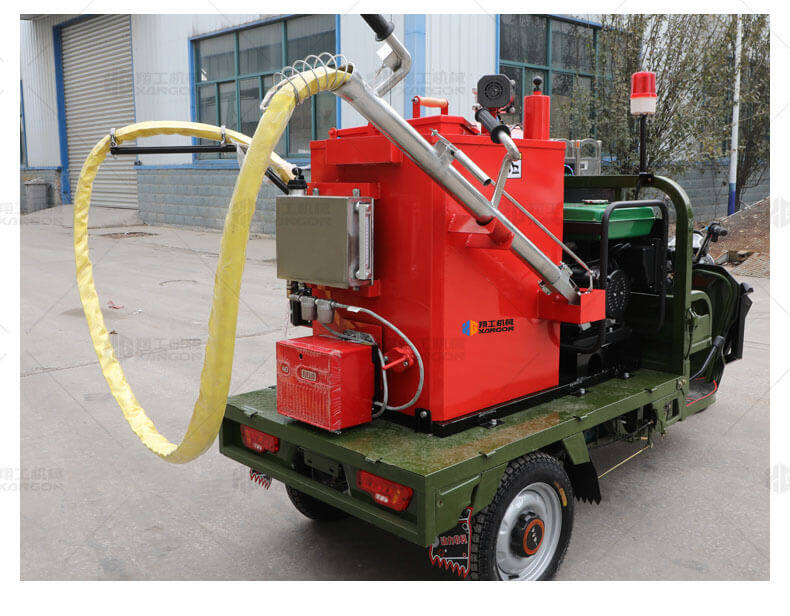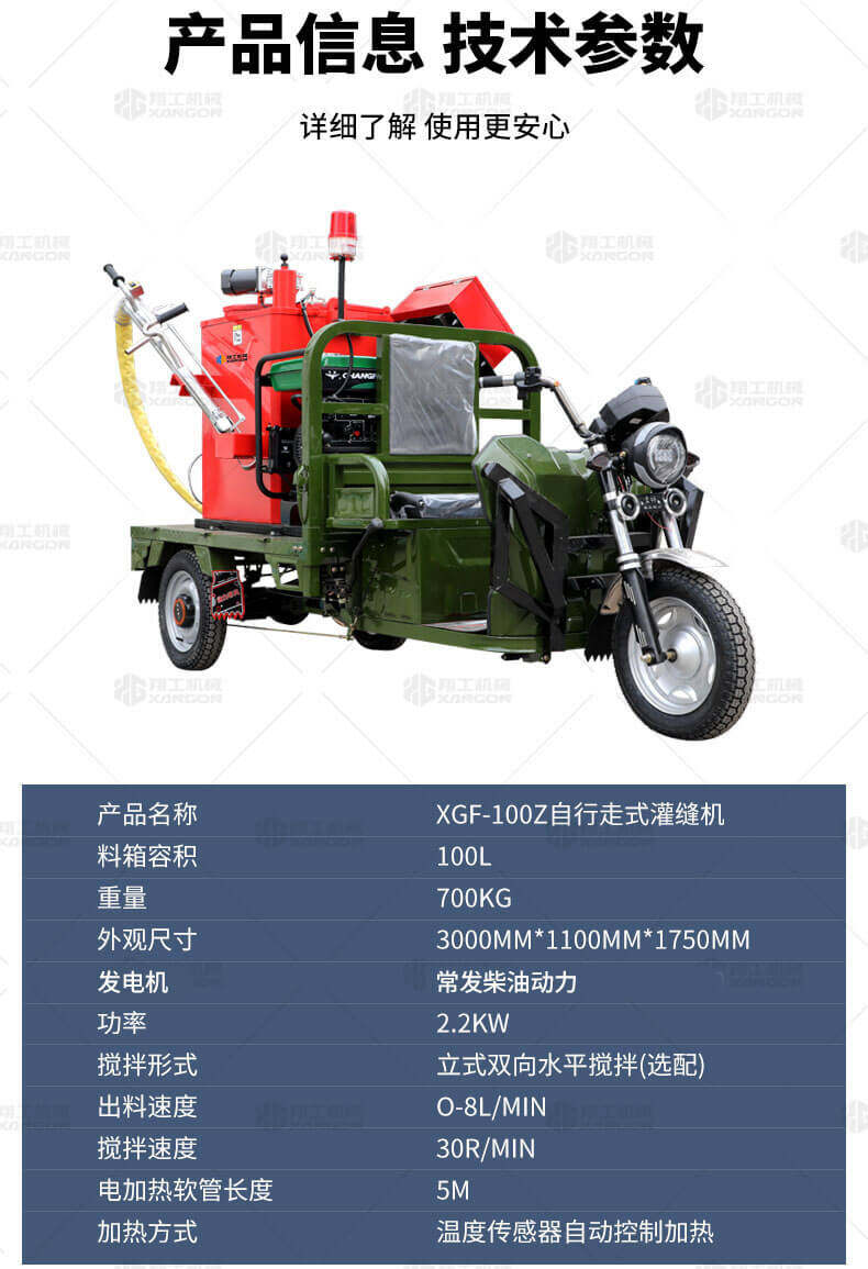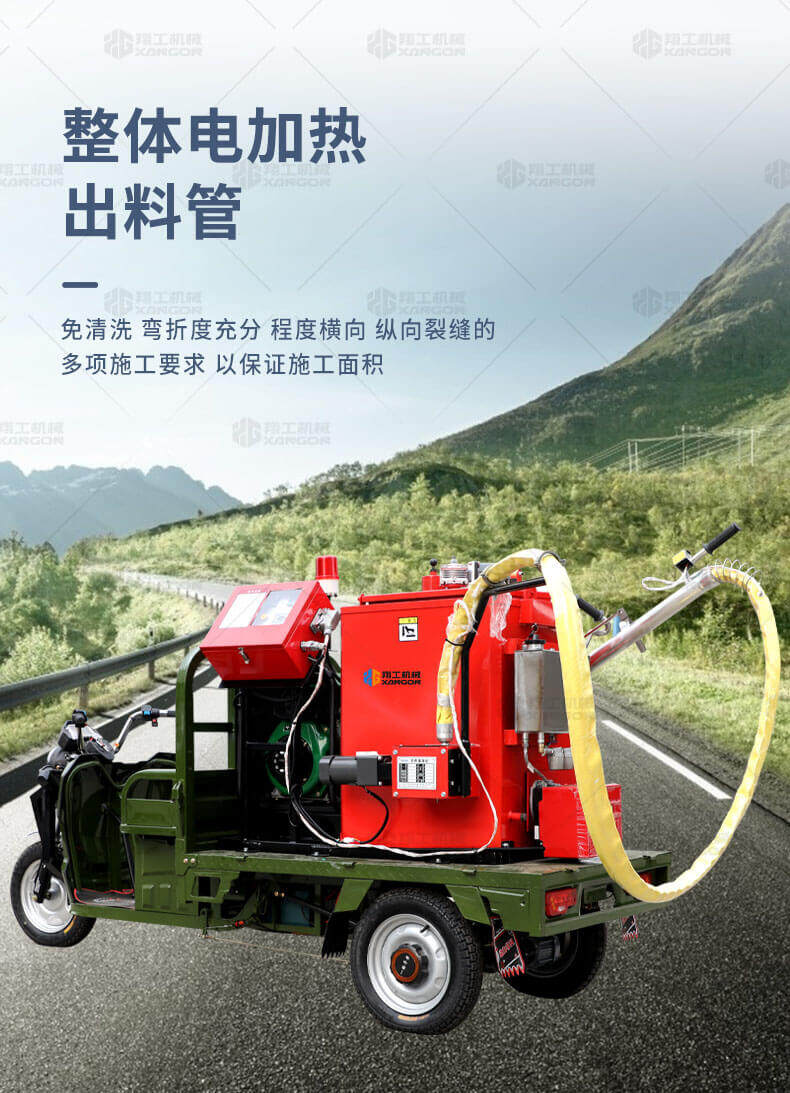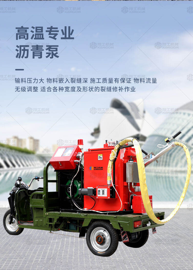 主要用于瀝青或水泥路面裂縫瀝青灌縫。汽油灌縫機(jī)主要有手推式和自行式手持灌縫管操作,采用進(jìn)口柴油燃燒器加熱。在工作時(shí)首先在料箱內(nèi)加入瀝青或灌縫膠,啟動(dòng)發(fā)電機(jī)供電,依次間斷打開導(dǎo)熱油泵開關(guān),燃燒器開關(guān),出料管加熱開關(guān);調(diào)整自動(dòng)溫控系統(tǒng)與材料的溫度相同,通過柴油燃燒器自動(dòng)加熱熔料箱內(nèi)導(dǎo)熱油開始升溫(拖式為強(qiáng)制循環(huán))使材料融化,溫度是通過自控系統(tǒng)來控制。溶料時(shí)間大約30-40分鐘左右。在材料融化、出料管溫度達(dá)到后可以進(jìn)行工作。手持灌縫管對(duì)正裂縫灌縫處理。瀝青泵的出料流量可調(diào)。在工作過程中隨時(shí)添加材料保證工作的連續(xù)性。