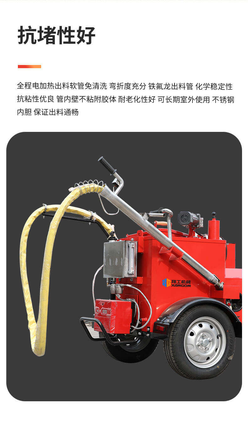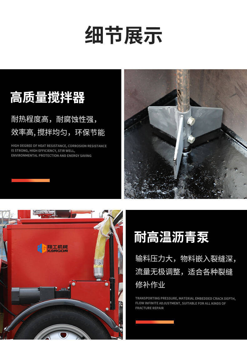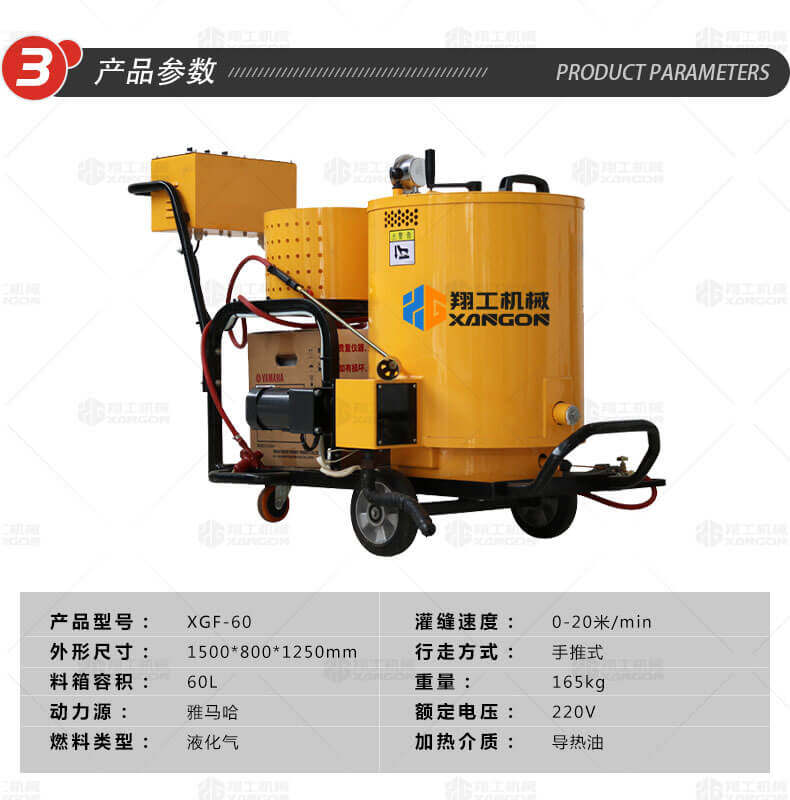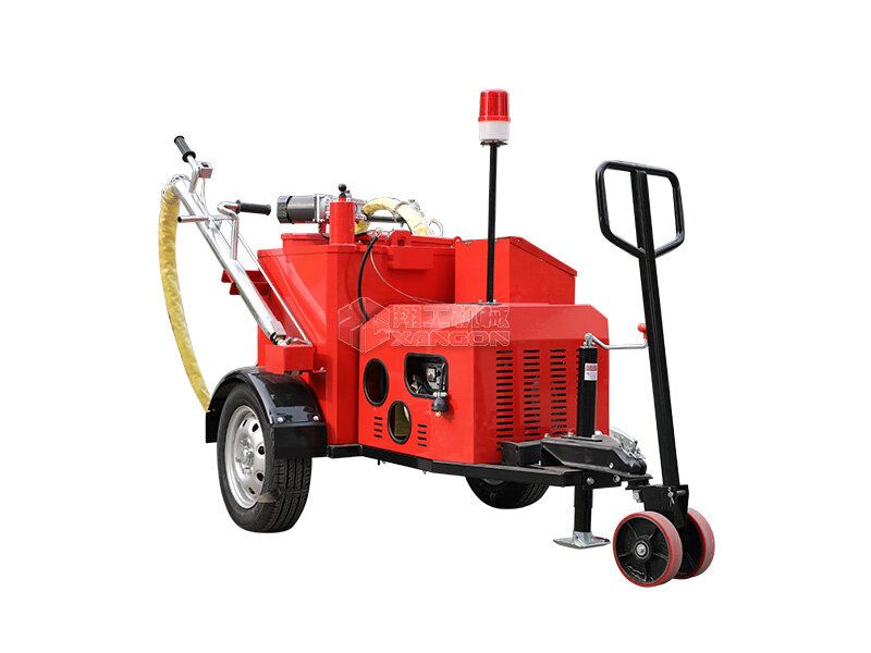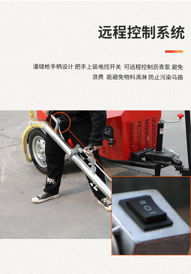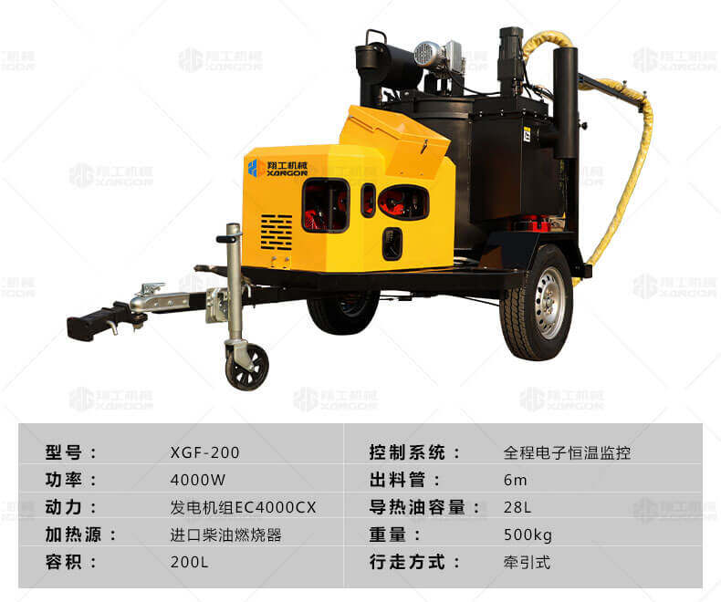 灌縫機主要有手推式和自行式手持灌縫管操作,采用進口柴油燃燒器加熱。在工作時首先在料箱內(nèi)加入瀝青或灌縫膠,啟動發(fā)電機供電,依次間斷打開導熱油泵開關(guān),燃燒器開關(guān),出料管加熱開關(guān);