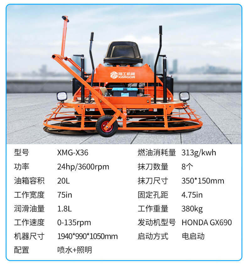 座駕式混凝土抹光機(jī)用于混凝土地面的提漿、壓實、抹平、抹光,相對于手扶式抹光機(jī),效率高。